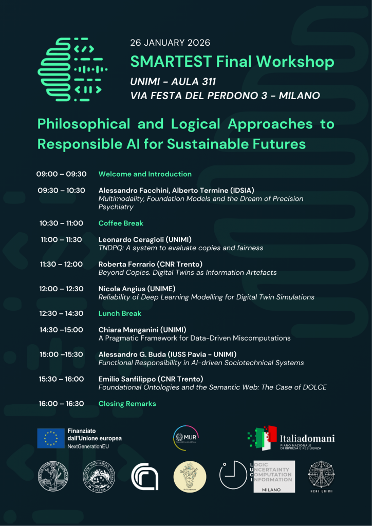 On 26 January 2026 at UNIMI (Aula 311, Via Festa del Perdono 3, Milan) the final event of the SMARTEST project will take place. This workshop will explore philosophical and logical approaches to responsible AI, focusing on applications and the foundations of trustworthy, sustainable artificial intelligence.