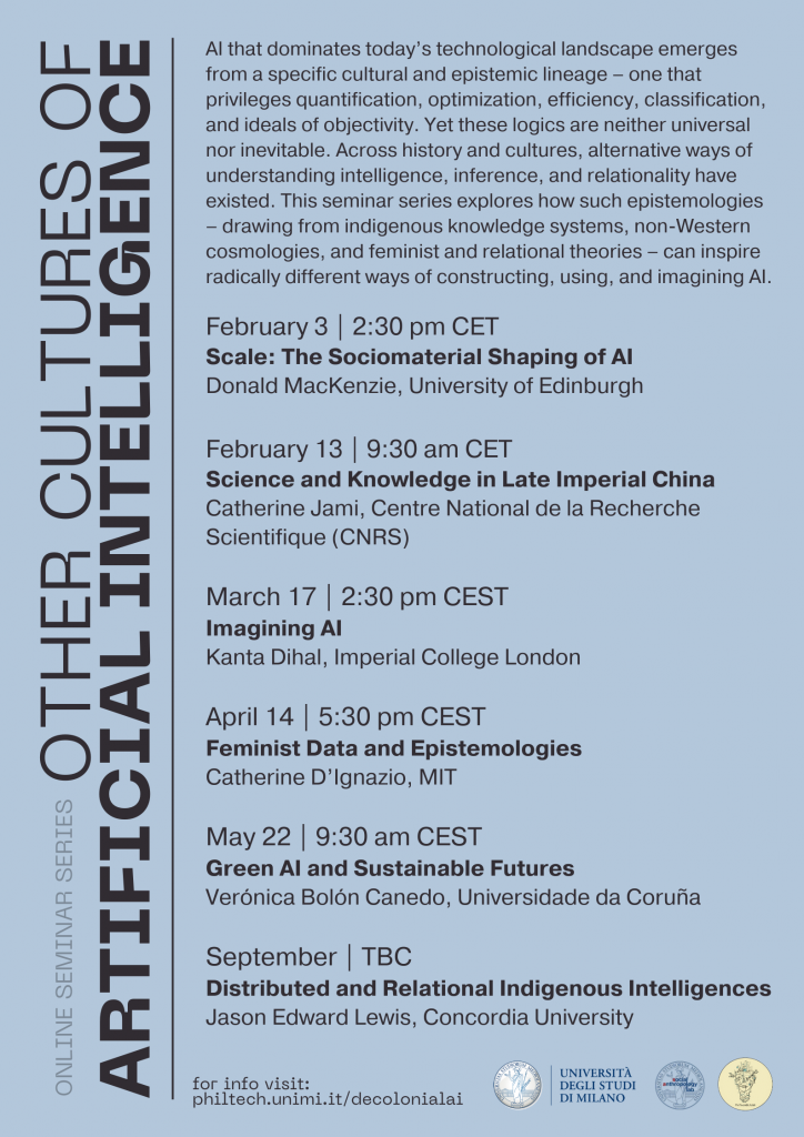 After the successful first edition of our Seminar Series Towards a Decolonized Artificial Intelligence, this year’s series starts from a simple but radical premise: AI that dominates today’s technological landscape is the product of a specific cultural and epistemic lineage – one that privileges quantification, optimization, efficiency, classification, and the ideal of objective decision-making. But these logics are not the only possible foundations for artificial intelligence. Across the world, and across history, many other ways of conceptualizing intelligence, information, inference, and relationality have existed. Many have been ignored, marginalized, or overwritten by dominant narratives of technology. This seminar series explores how these alternative epistemologies and overlooked scientific traditions – such as indigenous knowledge systems, non-western cosmologies, feminist and relational theories and computational models that complement and overcome the limitations of statistics – might inspire different ways of constructing, using, and imagining AI.